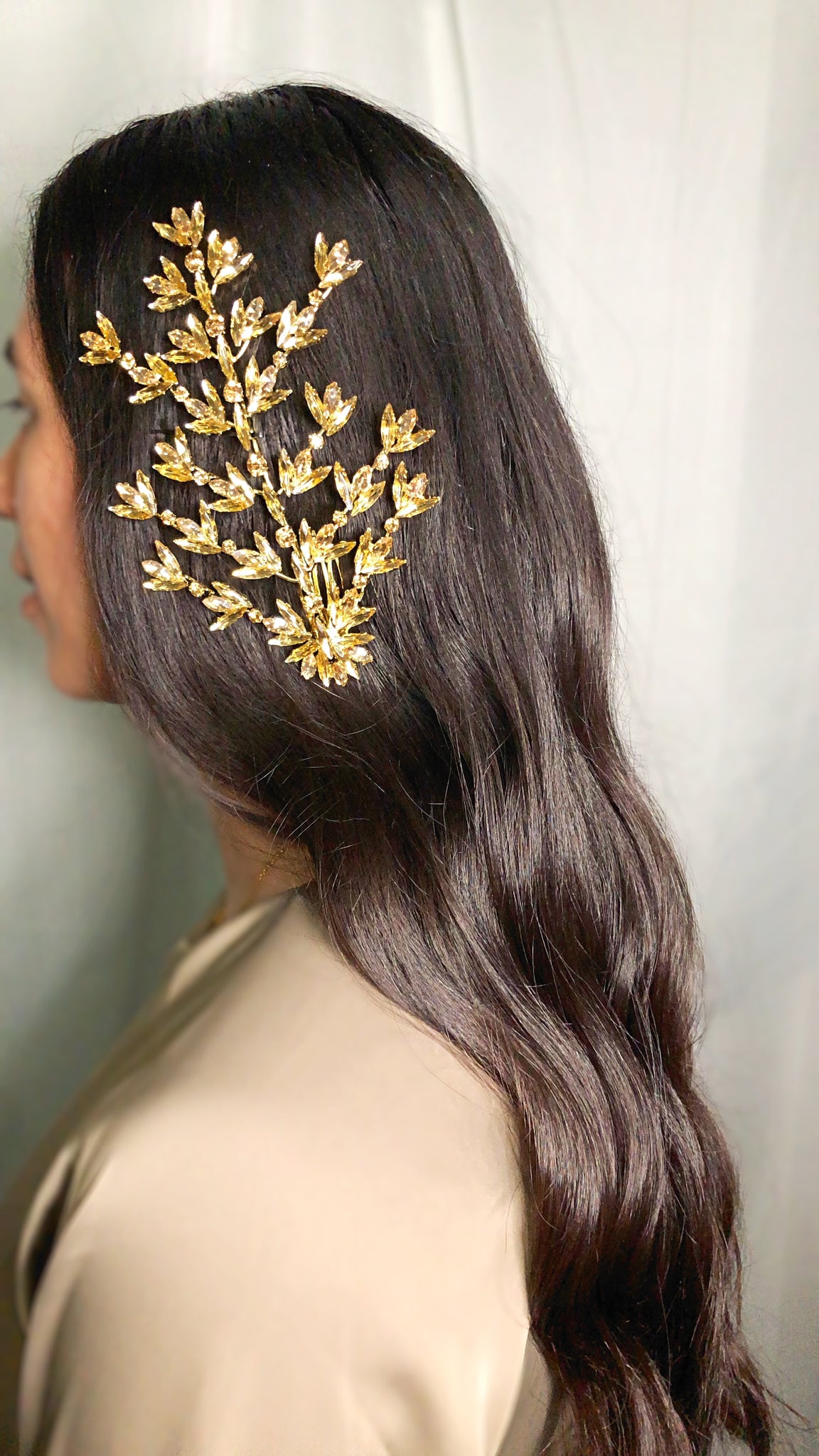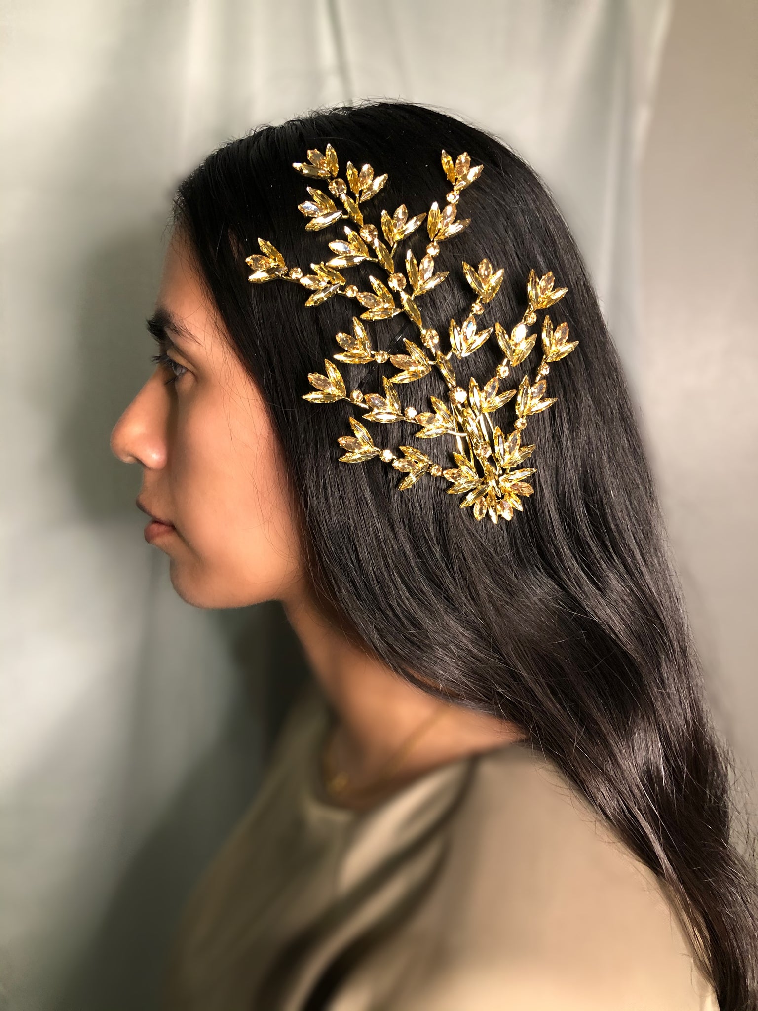 A gold embellished hair clip that can be worn as a side hairpiece or can be styled with 2, 1 on each side.